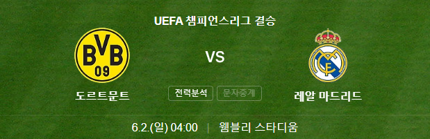 챔피언스리그의 강력한 우승후보1순위인 레알 마드리드가 모두가 예상하는 가운데 당당히 결승전에 진출하였고 유럽 강호들을 차례대로 격파하며 대이변을 일으킨 도르트문트가 예상밖의 선전으로 결승전에 진출하게 되어 이로써 양팀이 맞붙게 되었습니다.